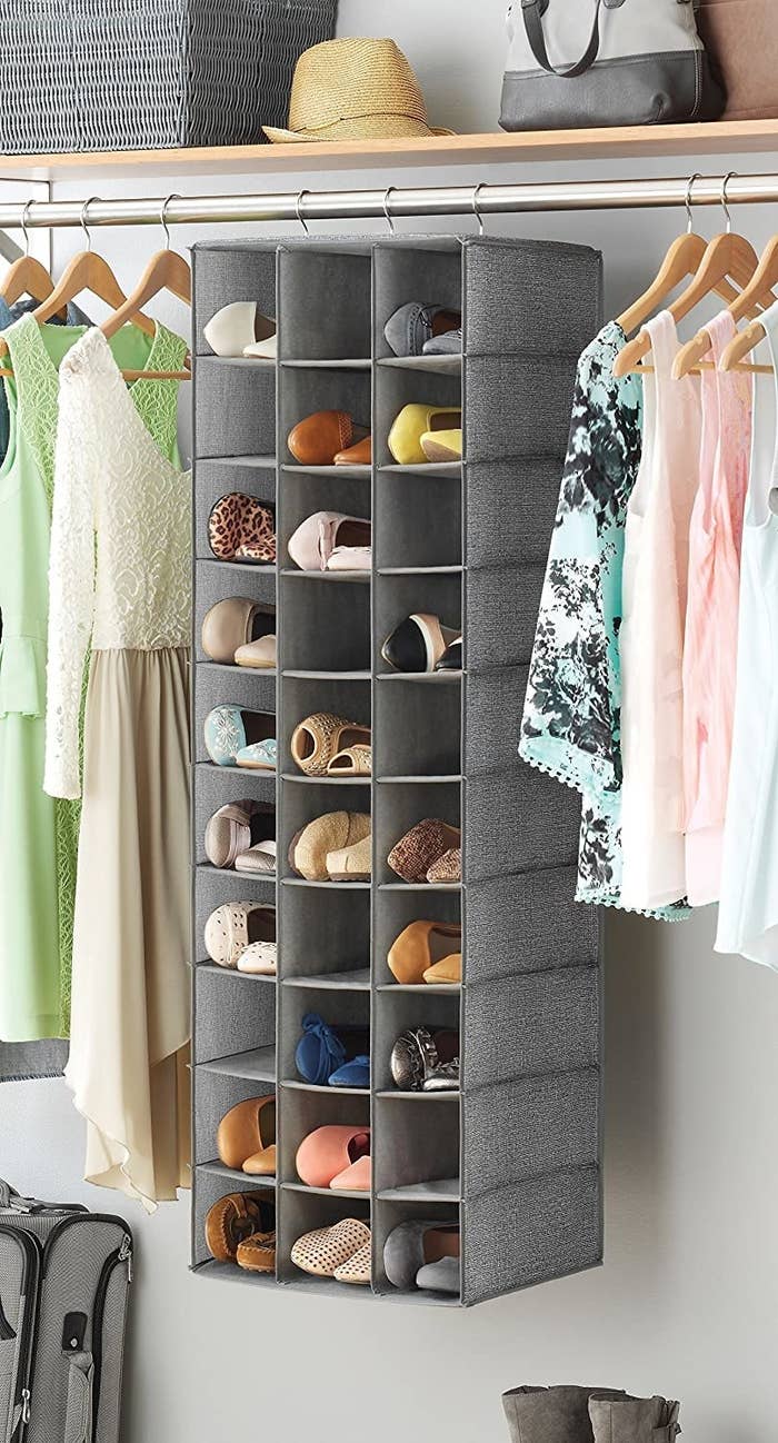 This large hanging shoe rack from Lovotex has plenty of cubbies for storing your many shoes. This thing can even fit bulky Crocs and its ready to hang. It can hold up to 60 pairs of shoes.