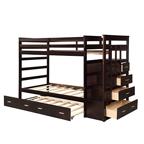 Wood Bunk Bed For Kids Twin Over Twin Bunk Bed Frame With Trundle And Staircase Espresso Finish Amazon In Home Kitchen